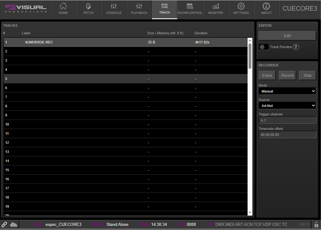 よって4ユニバースフルで使用しても、1トラックだと4時間、10分のショーだと25以上のシーンのレコーディングが可能ということになります。