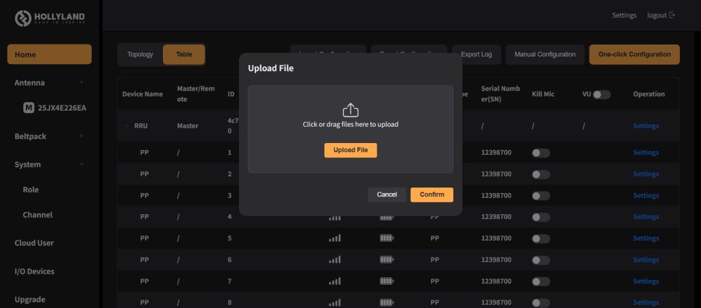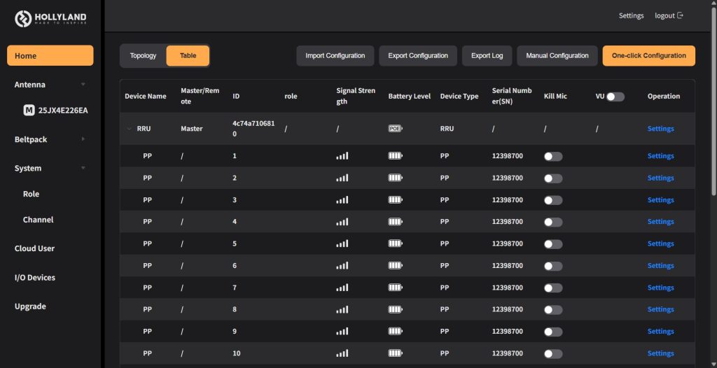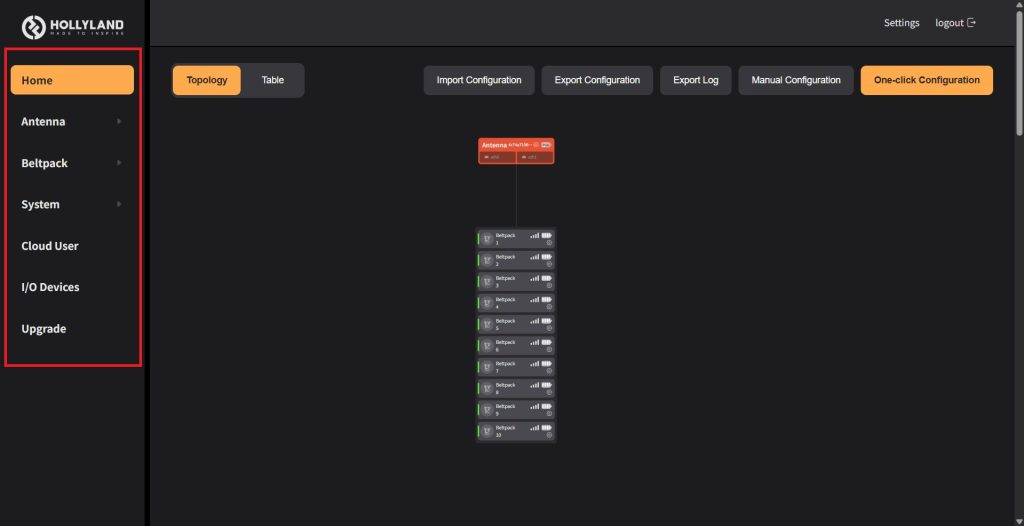 各設定は左端赤枠の縦軸に沿って行います。 HOMEのTopologyでは、ANT01に対してのベルトパックの接続状況が確認できます。
