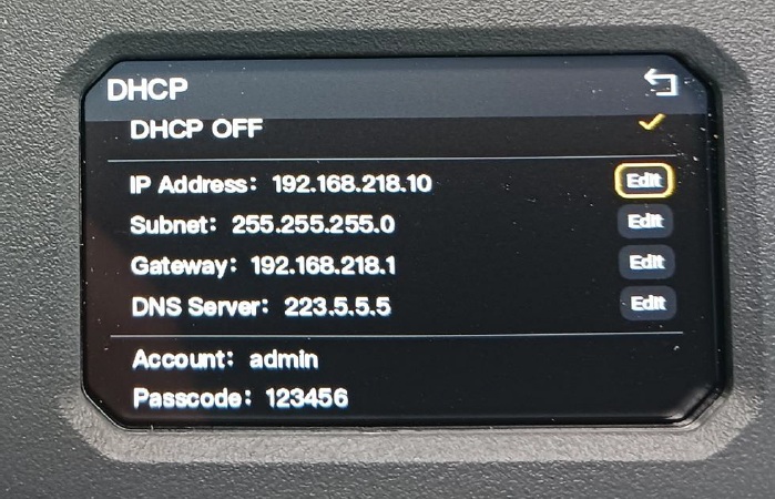 ANT01の赤丸のボタンを長押ししますとメニュー画面に入ることが出来ます。 そちらでNETWORKを選択しますと下記のように画面が表示されIPアドレスがご確認いただけます。