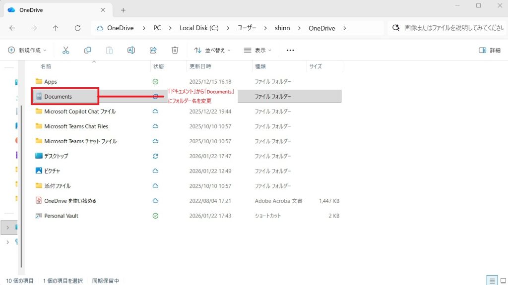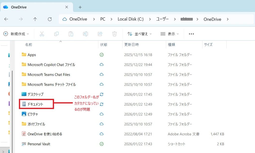 まず、Local Disk(C:)>ユーザー>OneDrive内の「ドキュメント」フォルダーの名前を半角英数「Documents」に変更してください。