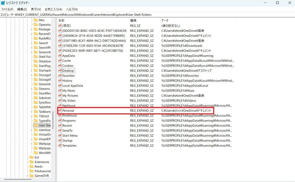 Personalの行がおそらくusername/oneDRive/ドキュメントになっているかと思います。